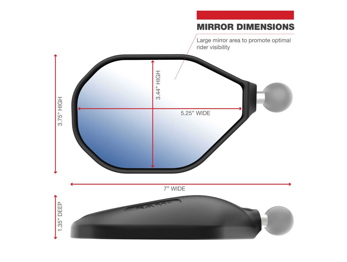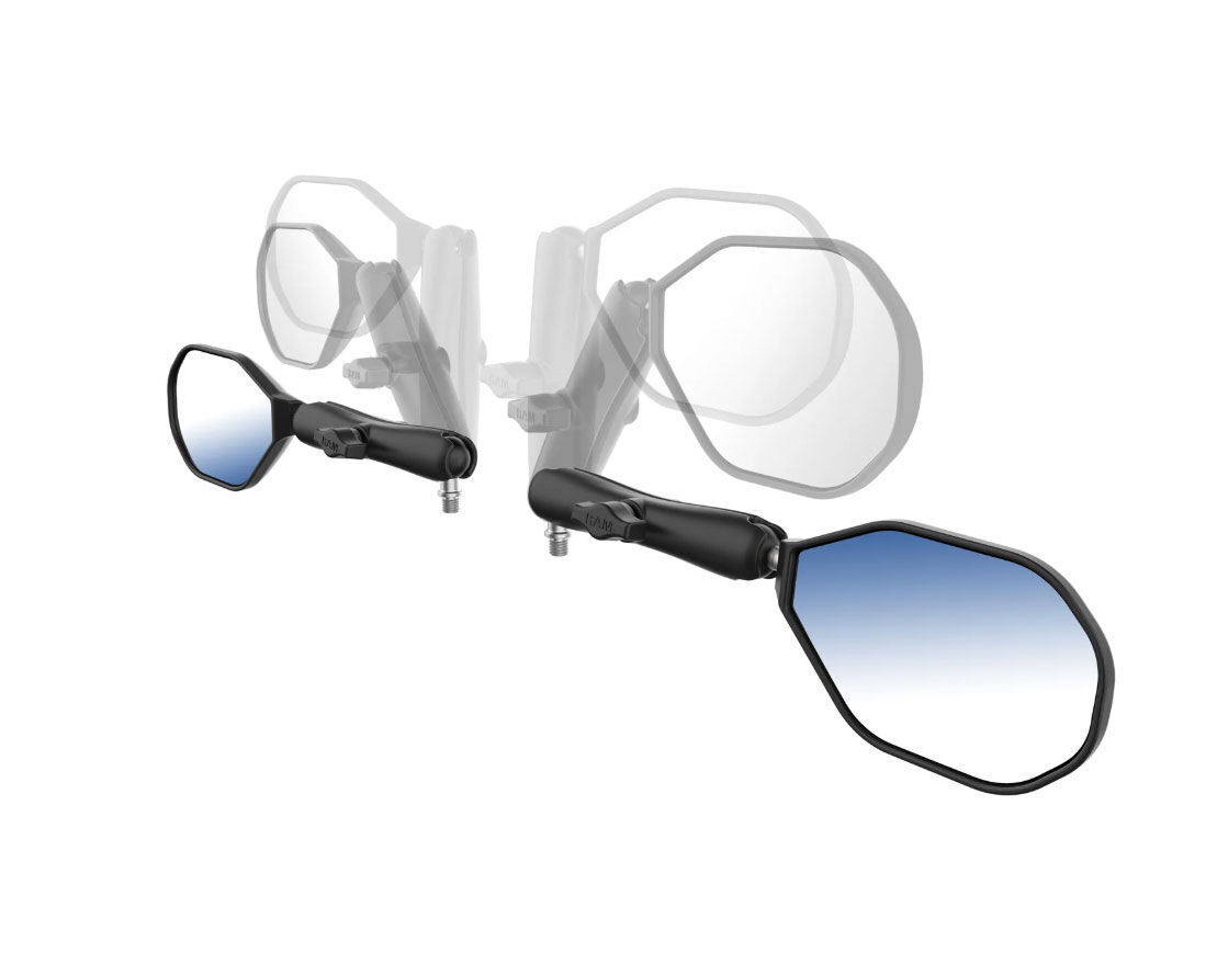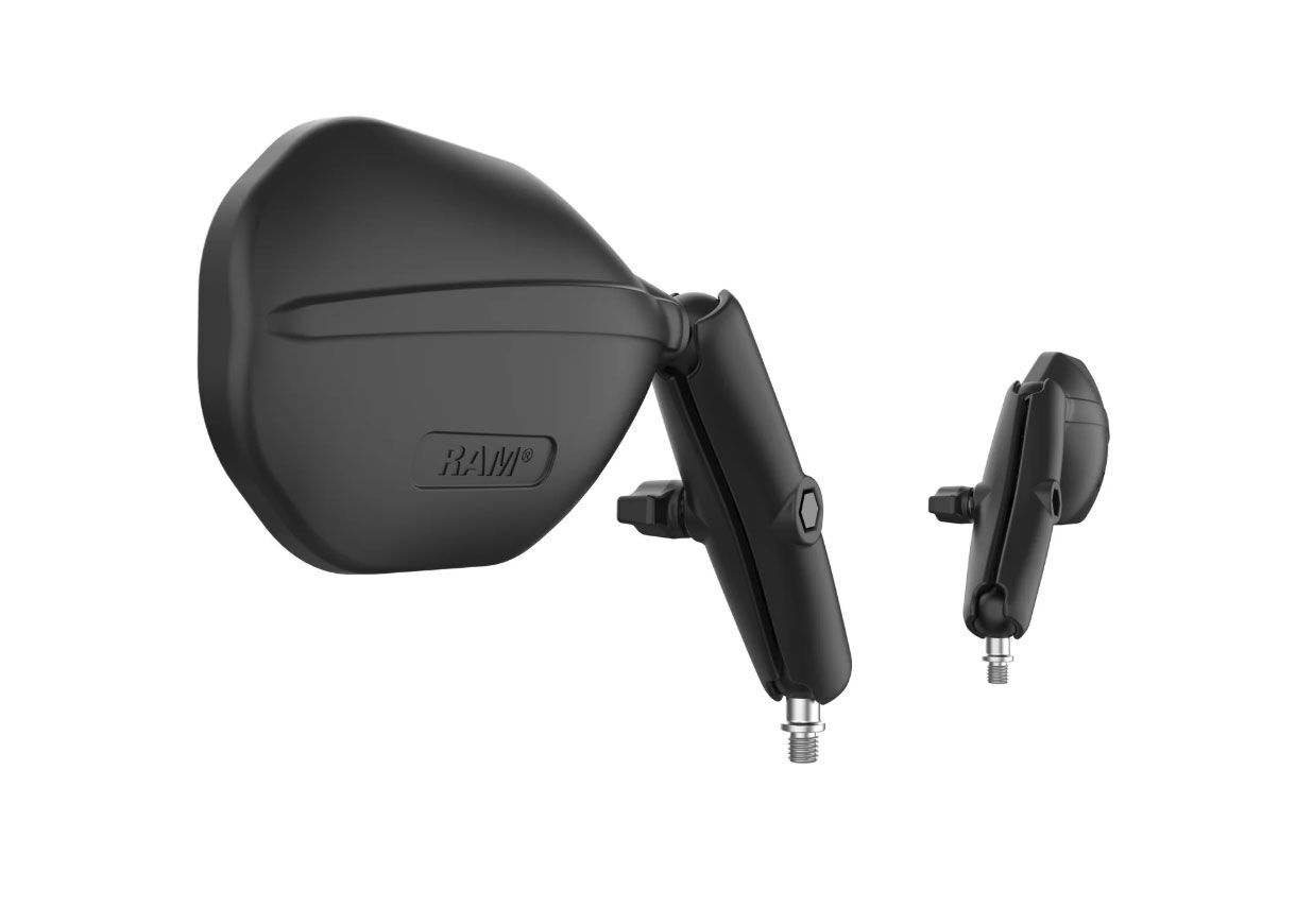 The RAM® Tough-Mirror™ Kit with M10-1.25 Bases - Long Arm (RAM-B-349-C-465RL) is designed for the adventurer. Whether you're cruising down the interstate or pushing limits on technical trails, you can trust the RAM® Tough-Mirror™ to have your back. This kit features 100% genuine RAM® ball & socket components to guarantee a secure connection throughout the system. The large mirrors offer the most visibility on the market and the housing is intentionally designed to be aerodynamic and cut through wind resistance. RAM® Mounts components are rugged and made with powder-coated, marine-grade aluminum, stainless steel components, and high-strength composite to withstand the most demanding environments. This kit comes with everything you need to get the RAM® Tough-Mirrors™ installed on your bike with two M10-1.25 RAM® ball bases, two long B size RAM® arms, one left RAM® Tough-Mirror™, and one right RAM® Tough-Mirror™. RAM® mounting components are backed by a lifetime warranty.