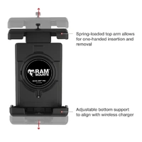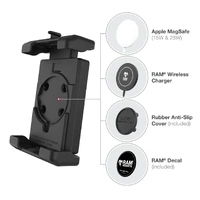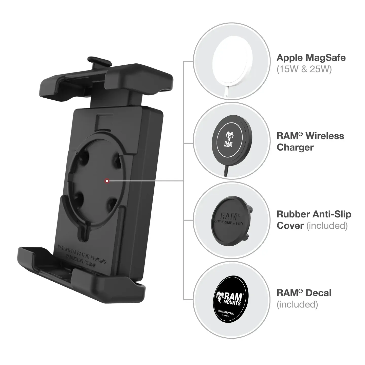 The RAM® Quick-Grip™ Pro XL Phone Holder with Ball (RAM-HOL-PD7BU) is the next evolution of the RAM® Quick-Grip™ series, re-designed to be the most rugged universal phone holder that fits a wide range of phones and handheld devices. This phone holder features an integrated cavity for an Apple MagSafe puck, allowing you to turn the phone holder into a wireless charging solution. Not interested in charging? No problem! The included anti-slip cover ensures a flush fit when the Apple MagSafe puck is not installed. The RAM® Quick-Grip™ Pro XL features a spring-loaded design that allows easy one-handed insertion and removal of your device. Large and small shims are included to provide a snug, secure fit for large and small phones without a case. Complete the solution by building your mount—this holder is RAM® Compatible™ and includes a B size diamond ball to be installed on the 2-hole AMPS pattern. RAM® recommends installing the provided device tether when this holder is used in a vehicle with an open cockpit. It is important to verify the dimensions of your handheld device with its case, sleeve, or skin when determining the overall size.